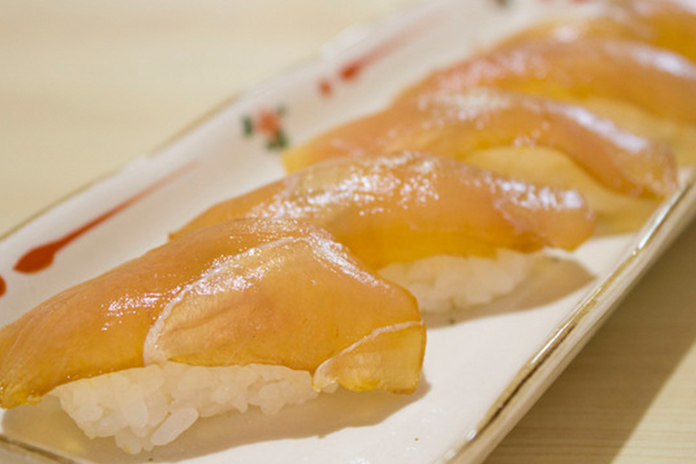 大東島の家庭料理の一つでもある大東寿司は、甘めのタレに漬け込んだカジキのズケを握った寿司。